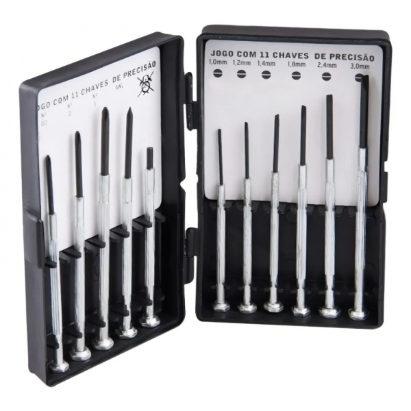 O Estojo com 11 Chaves de Precisão é ideal para trabalhos com pequenas peças, oferecendo a precisão necessária e delicadeza para não danificar os componentes.